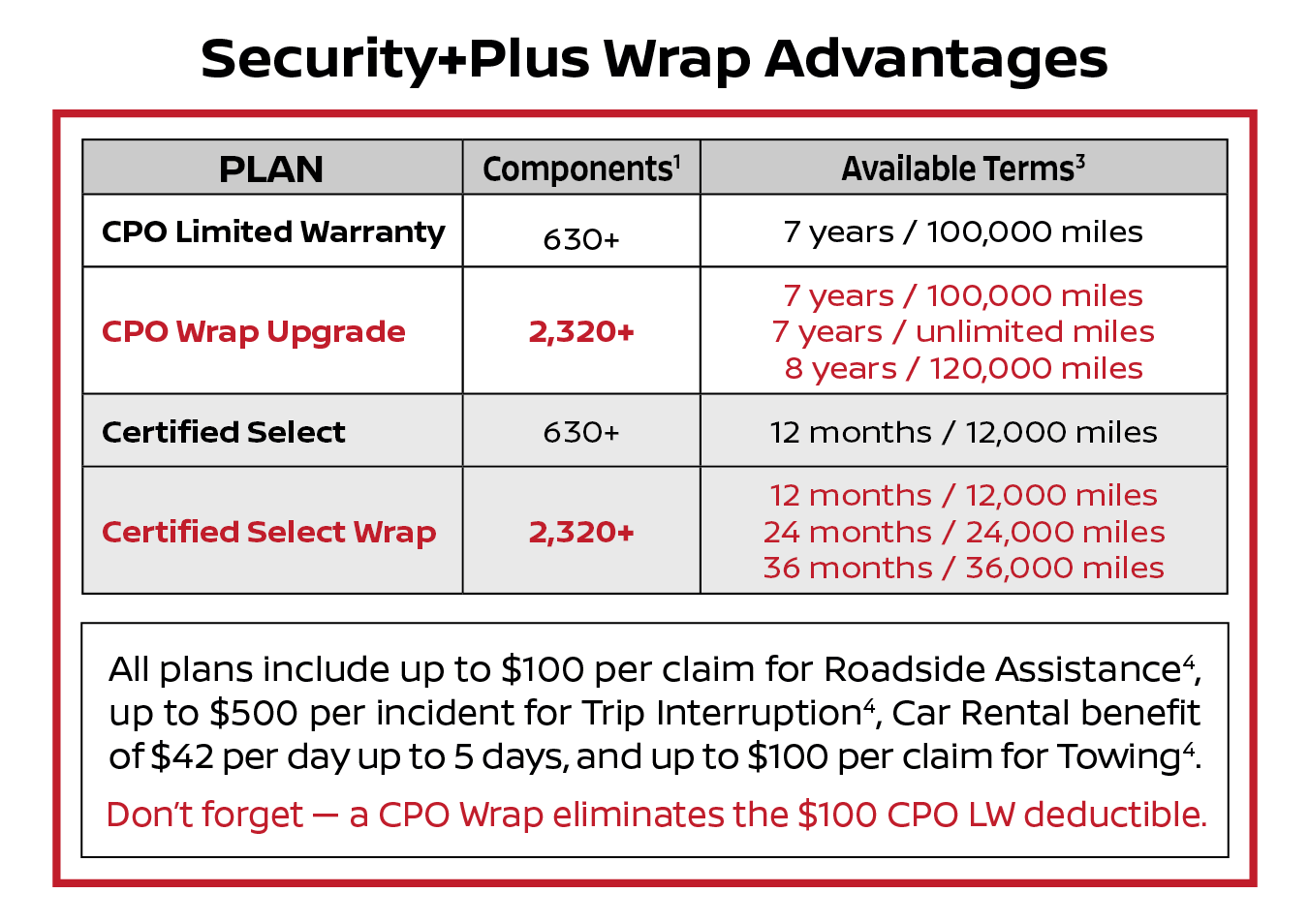 Our contract terms and options provide you with an unparalleled long-term value, right now. The Security+Plus Gold Preferred Plan covers virtually all major components on your Nissan, providing a truly worry-free driving experience.